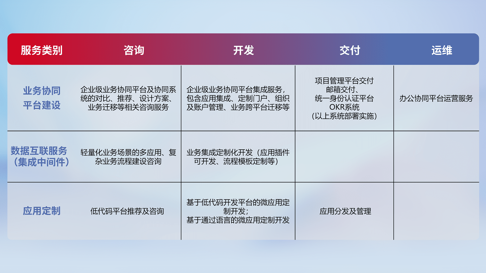 针对钉钉、、、、企微、、IDaas等平台级产品提供产品的规划、、、方案、、、、交付、、定制化开发等服务,,实现如统一协同办公、、、智能客户服务、、混合会议管理、、、智能数据查询、、、、等业务场景,,,实现数字化转型。。。